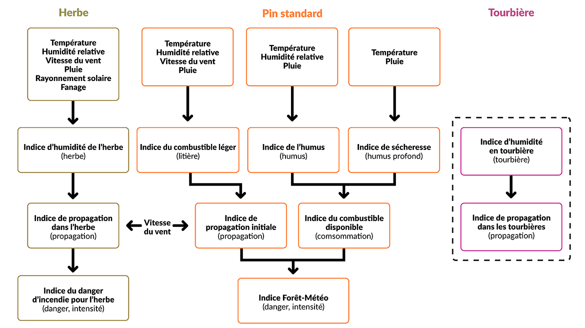Organigramme montrant les indices d'humidité et les indices de comportement des incendies pour les types de combustibles « herbe », « pin standard » et « tourbières ».