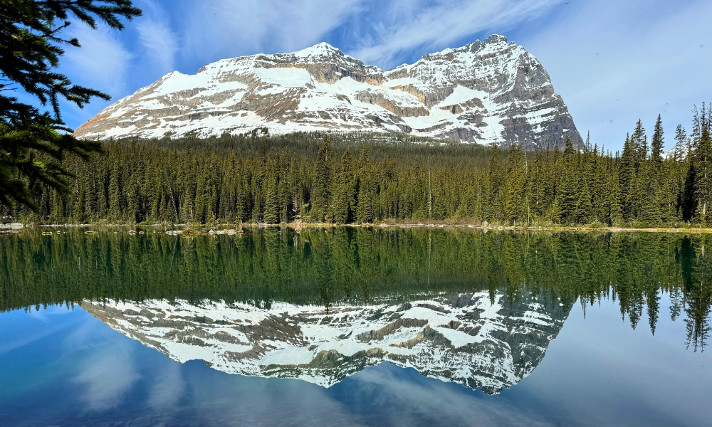 J’ai pris cette photo par un matin de juillet très enneigé dans le parc national Yoho, en Colombie-Britannique, pendant une randonnée sur le sentier Lakeshore autour du lac O’Hara avec ma mère de 94 ans et mon fils de 17 ans. Tel un miroir, le lac reflétait parfaitement le mont Schaefer. C’était magique, si calme. On n’entendait que le chant lointain des chutes Seven Veils, parfois le croassement d’un corbeau ou le cri d’un aigle, et soudain au loin le fracas de la neige déboulant des sommets sous le soleil matinal. C’était un moment inoubliable. — Geordie Hobart, physicien