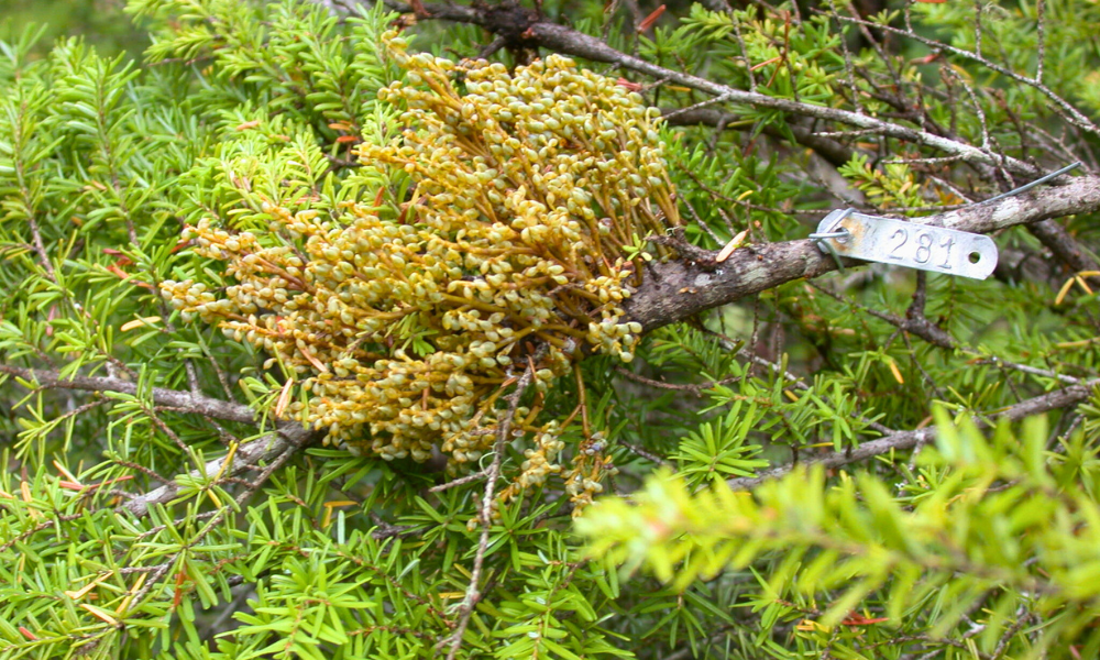 Cette photo montre une espèce de faux-gui de la pruche (Arceuthobium tsugense (Rosend.) subsp. tsugense) sur des branches de pruche (Tsuga heterophylla). La photo a été prise au lac Cowichan, sur l’île de Vancouver, lors de recherches sur le contrôle biologique du faux-gui de la pruche, une petite plante parasitaire grandement répandue et nuisible qui sévit dans les peuplements de pruches sur les côtes de la Colombie-Britannique. — Simon Shamoun, chercheur scientifique
