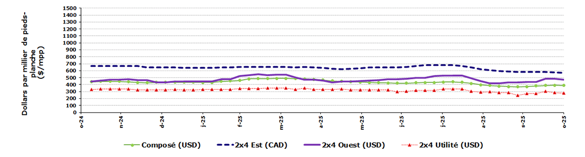 Nota : épinette-pin-sapin de l’Est 2x4 de qualité #2 et meilleure; et le prix composite publié par Random Lengths et épinette-pin-sapin de l'Ouest 2x4 de qualité #2 et meilleure et séché au séchoir