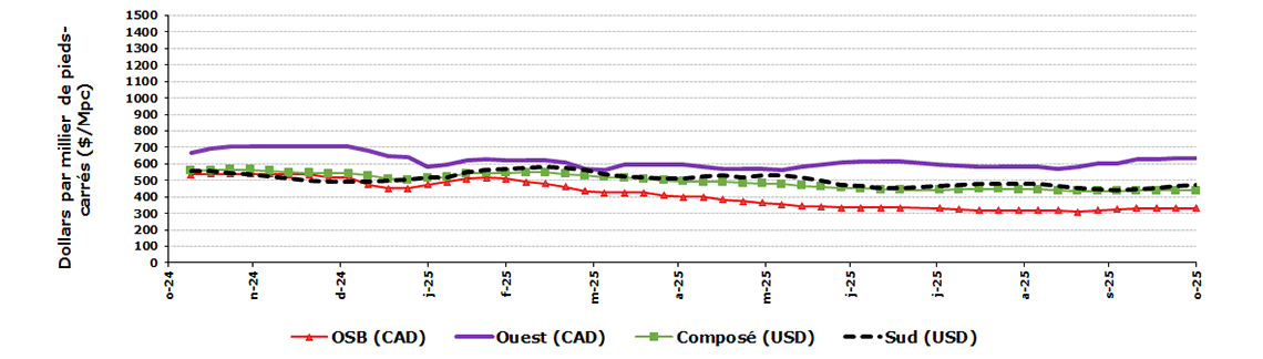 Nota : le prix composite des panneaux de construction publié par Random Lengths; 15/32" 4 plis extérieur du Sud, 1/2" 4 plis extérieur de l’Ouest et 7/16" panneaux de lamelles orientées du Centre Nord