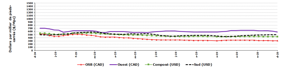 Dollars par millier de pieds-planche | 19 décembre 2025 | 12 décembre 2025 | Moyenne de 4 semaines | Moyenne de 52 semaines |