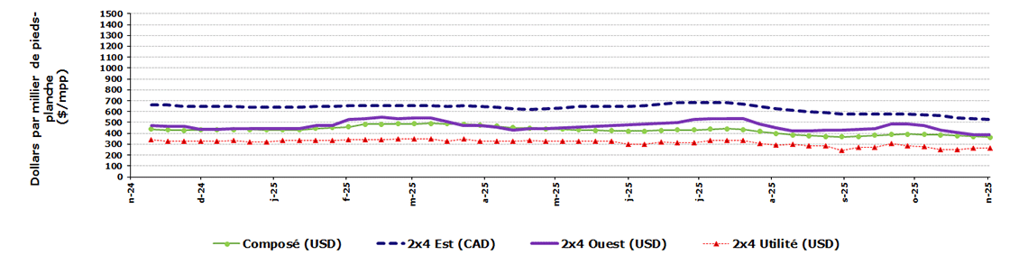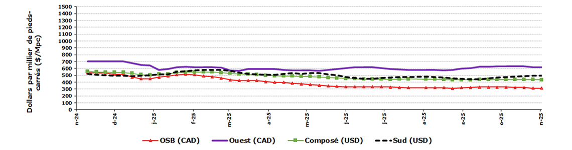Dollars par millier de pieds-planche | 28 novembre 2025 | 21 novembre 2025 | Moyenne de 4 semaines | Moyenne de 52 semaines |