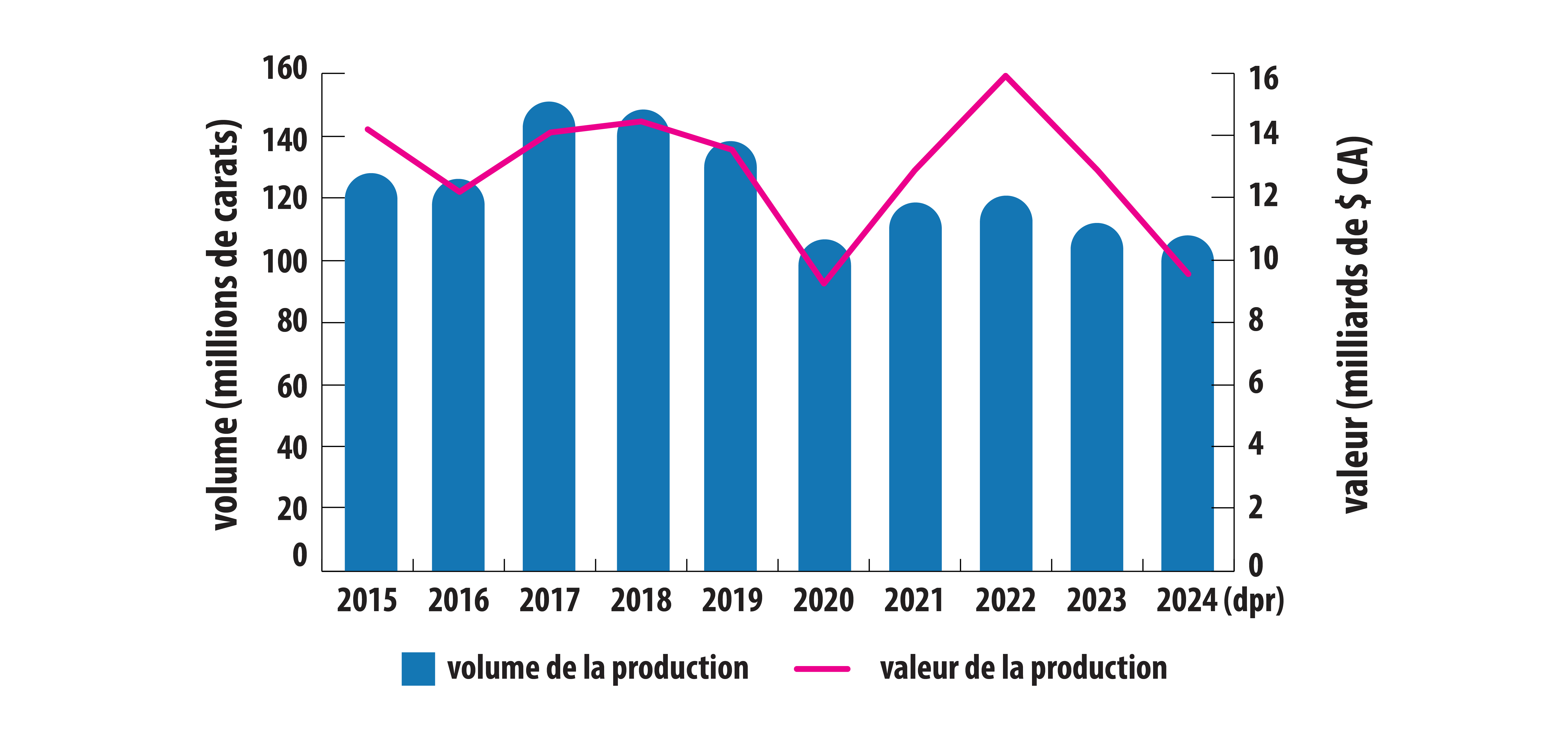 Ce diagramme en barres montre le volume annuel de production de diamants bruts dans le monde, de 2015 à 2024. En 2015 et en 2016, le volume de production est resté stable à 128,3 et à 126,4 millions de carats, respectivement, avant d’augmenter fortement pour atteindre 150,9 millions de carats en 2017. Il a ensuite légèrement diminué pour atteindre 148,4 millions de carats en 2018, avant de baisser pour se chiffrer à 138,2 millions de carats en 2019. Le volume de production a encore baissé de 22 % pour atteindre 107,1 millions de carats en 2020, avant d’augmenter à 118,7 et à 120,7 millions de carats en 2021 et en 2022, respectivement. En 2023, le volume de production était de 112,1 millions de carats, avant de baisser légèrement à 107,9 millions de carats en 2024. Une ligne représentant la valeur de la production annuelle de diamants bruts dans le monde, en dollars américains, au cours de la même période est superposée au diagramme en barres. En 2015, la valeur de la production mondiale s’élevait à 14,2 milliards de dollars américains, avant qu’elle diminue pour se chiffrer à 12,3 milliards de dollars américains en 2016. De 2017 à 2019, la valeur de la production est restée stable, à environ 14 milliards de dollars américains, avant de chuter brutalement de 32 % pour se chiffrer à 9,2 milliards de dollars américains en 2020. La valeur de la production a ensuite rebondi de 40 % pour atteindre 12,9 milliards de dollars en 2021, puis de 24 % pour atteindre 16,0 milliards de dollars en 2022. En 2023, la valeur de la production a diminué pour se chiffrer à 12,9 milliards de dollars américains, avant de baisser encore une fois de 26 % pour atteindre 9,5 milliards de dollars américains en 2024.