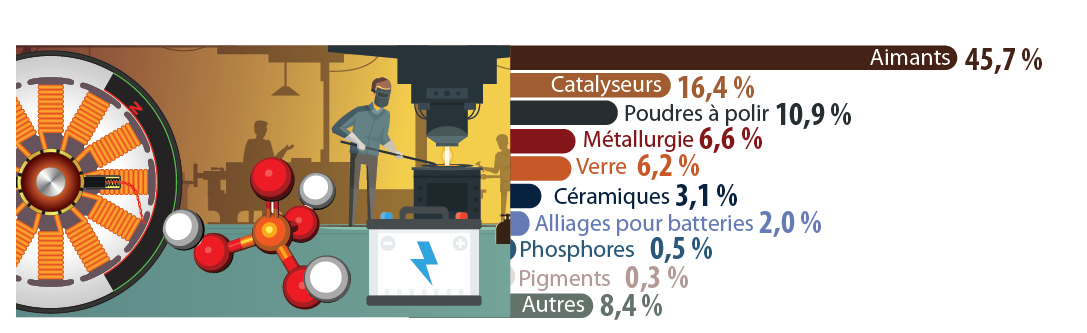 L’utilisation la plus importante des ETR est la production d’aimants permanents, qui représentait 45,2 % de la demande mondiale en 2023. Ces aimants sont essentiels pour des produits, comme les téléphones cellulaires, les téléviseurs, les ordinateurs, les automobiles, les appareils d’IRM, les avions à réaction, etc.