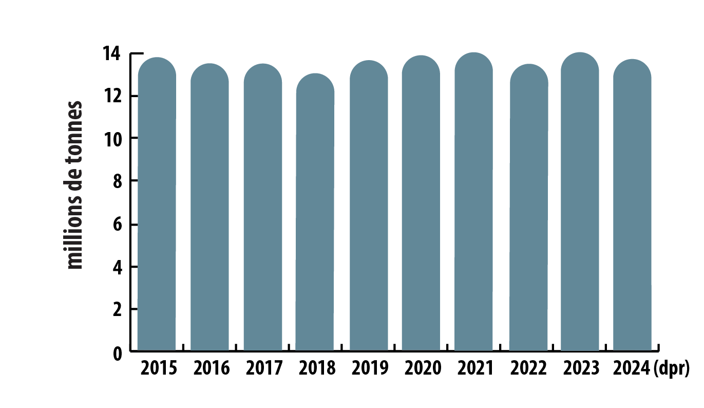 Ce graphique montre la production annuelle mondiale de zinc affiné de 2015 à 2024. La production était de 13,8 millions de tonnes en 2015, et a diminué chaque année entre 2016 et 2018 pour atteindre 13,1 millions de tonnes. Elle a ensuite atteint son niveau le plus élevé de la décennie, soit 14,1 millions de tonnes, en 2021. La production a baissé pour atteindre 13,5 millions de tonnes en 2022, avant de rebondir pour se chiffrer à 13,9 millions de tonnes en 2023, puis redescendre à 13,7 millions de tonnes en 2024.