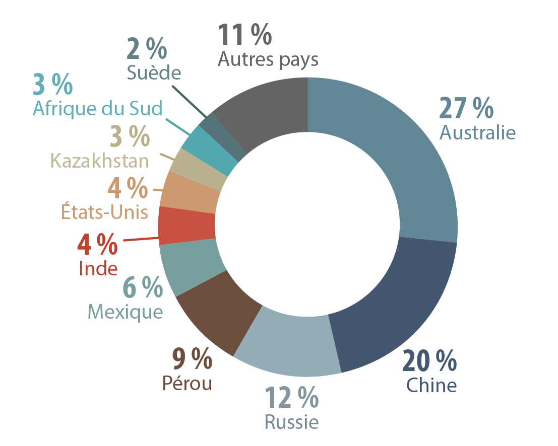 - Les États-Unis étaient la principale source de concentrés de zinc (52 %), suivis de l’Australie (17 %), du Pérou (14 %), du Mexique (7 %) et de la Bolivie (4 %).