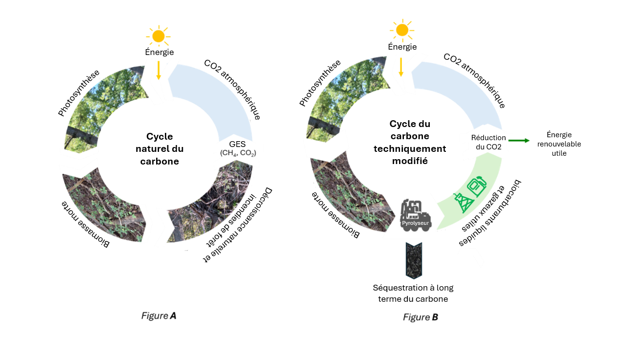 La figure B (à droite) illustre un cycle du carbone techniquement modifié au cours duquel la biomasse morte est transformée en biocarburants liquides et gazeux utiles, et une grande quantité de biocharbon à forte intensité carbonique est appliquée en guise d’amendements du sol ou utilisée pour la séquestration à long terme du carbone. Cette approche technique offre des avantages sur le plan environnemental et économique aux collectivités de la région.